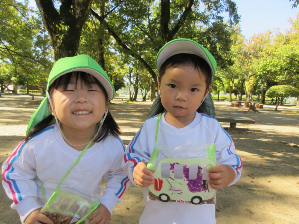 みんなが作ったバスのカバンを持って、どんぐり探しスタートです!!
