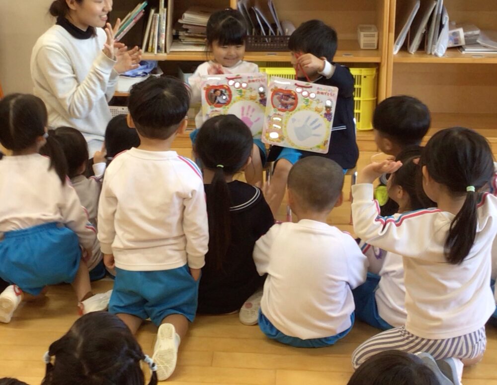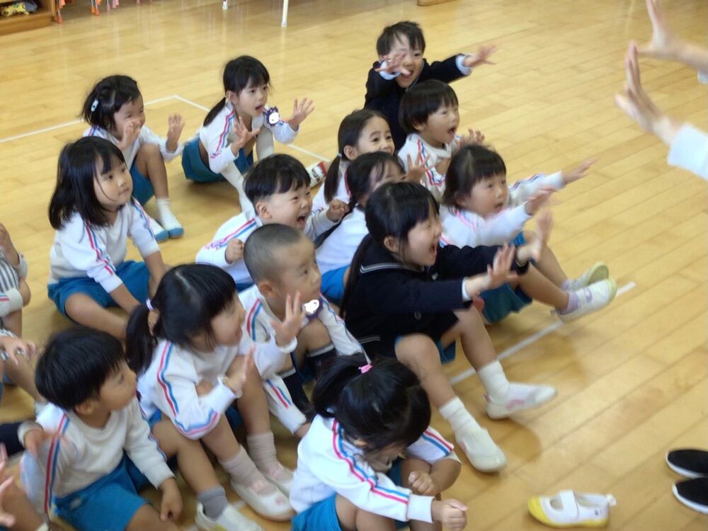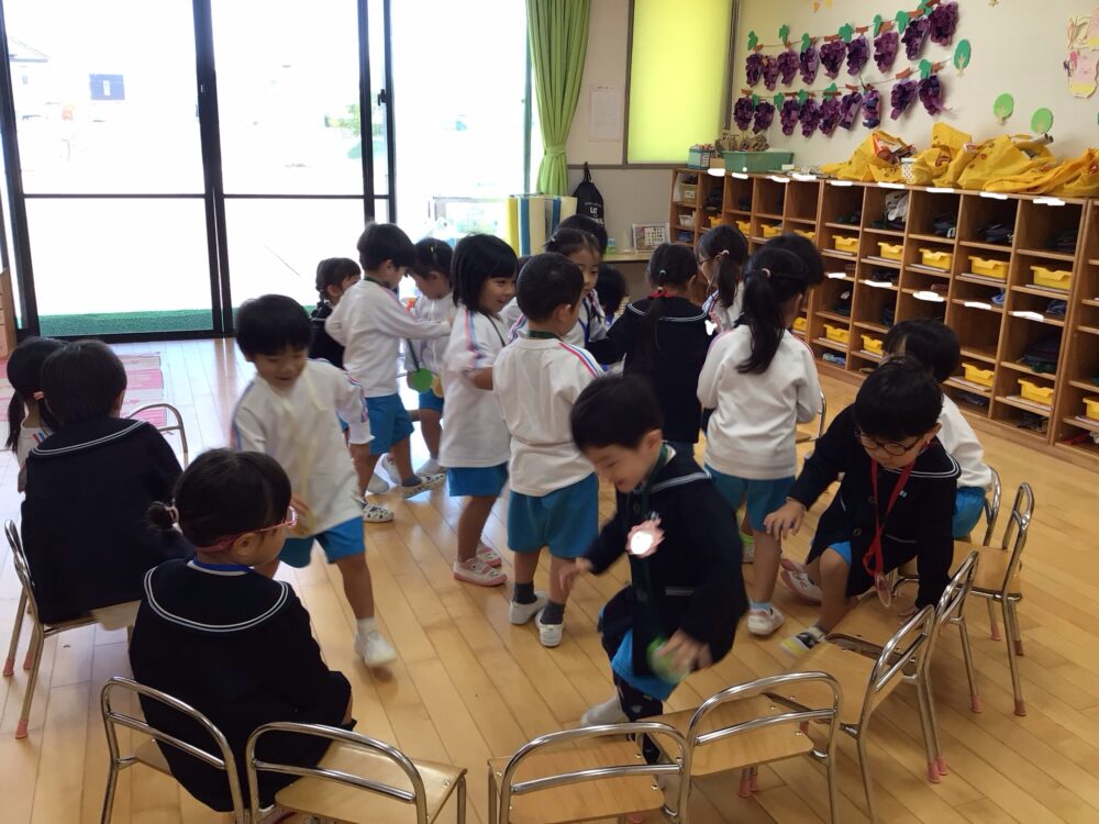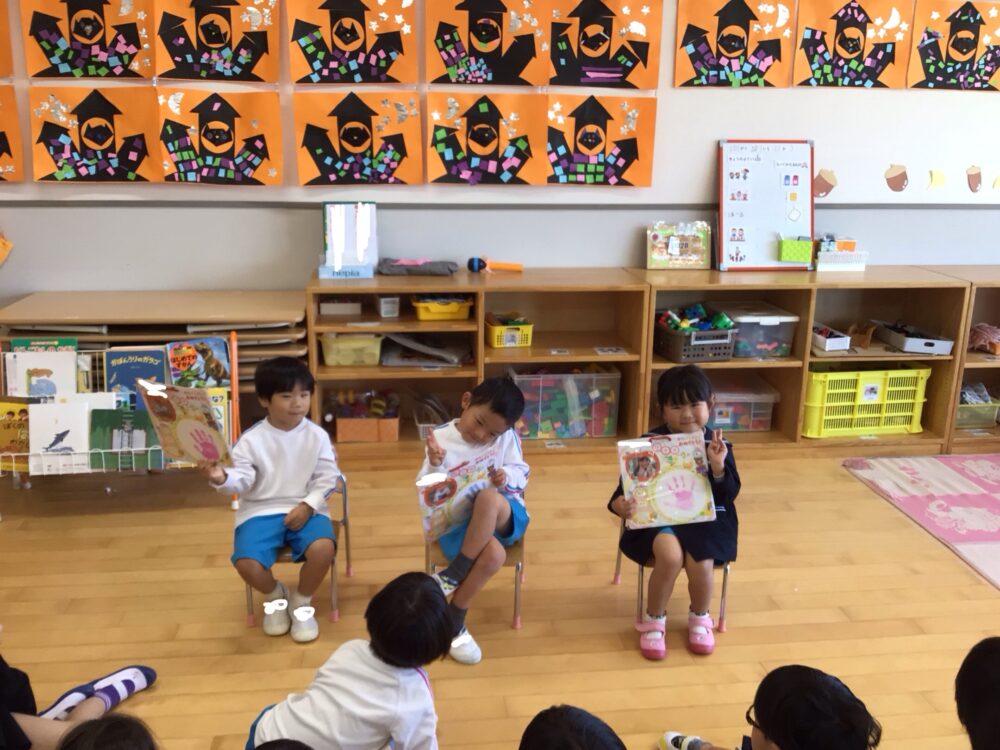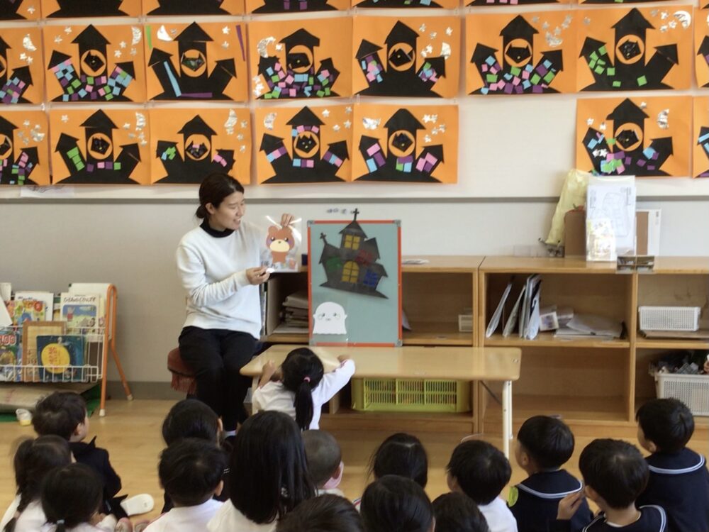 ぶどう組はお化けの手遊びをしたあと、ハロウィンにちなんだシアターをしました。