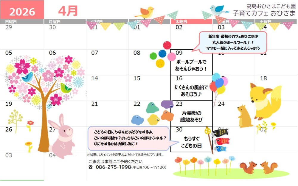 | 持ち物 | お子様の飲み物やおやつは各自ご用意ください |
