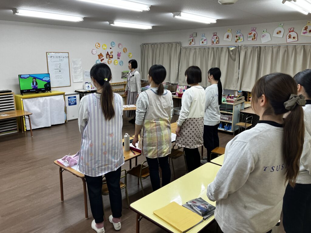 先生のまなび 英語研修がありました。(3歳児クラス) 2025.12.22 玉川大学院名誉教授の佐藤久美子先生による英語研修がありました。3学期のカリキュラムに沿って研修をしていただきました。子どもと一緒にできるジェスチャーや単語などを学び、子ども役と先生役に分かれて実際にやり取りも行いました。楽しい雰囲気の中で研修をさせていただいたので、実際に子どもに指導する際にも子どもが「英語楽しい!」と思えるように、3学期も指導していきたいと思いました。 つしま幼稚園 前田 樹里 記 英語研修がありました(2歳児) 前の記事 保護者セミナー第4回英語ワークショップ開催 次の記事
