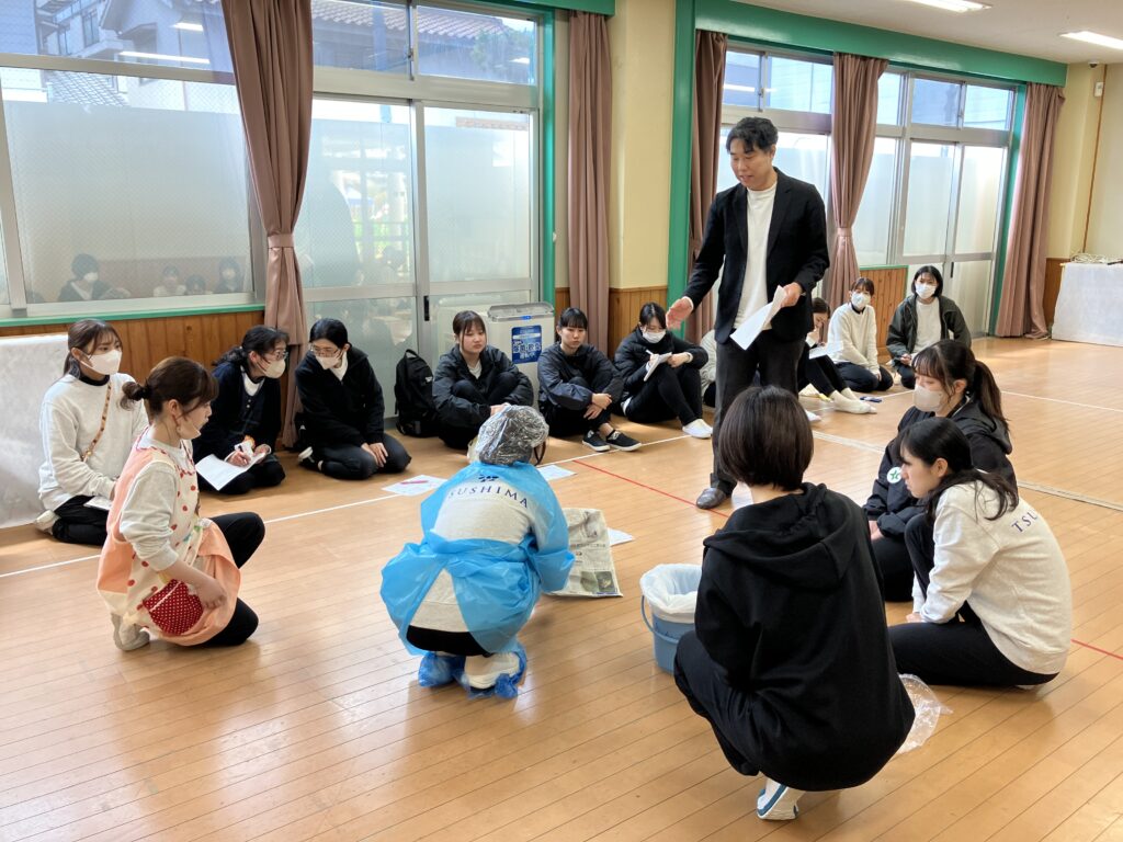 嘔吐処理では嘔吐したときにどのような対処をしたらよいのか実際にやってみながら学びました。