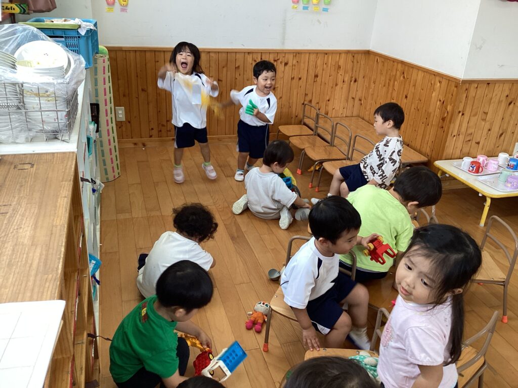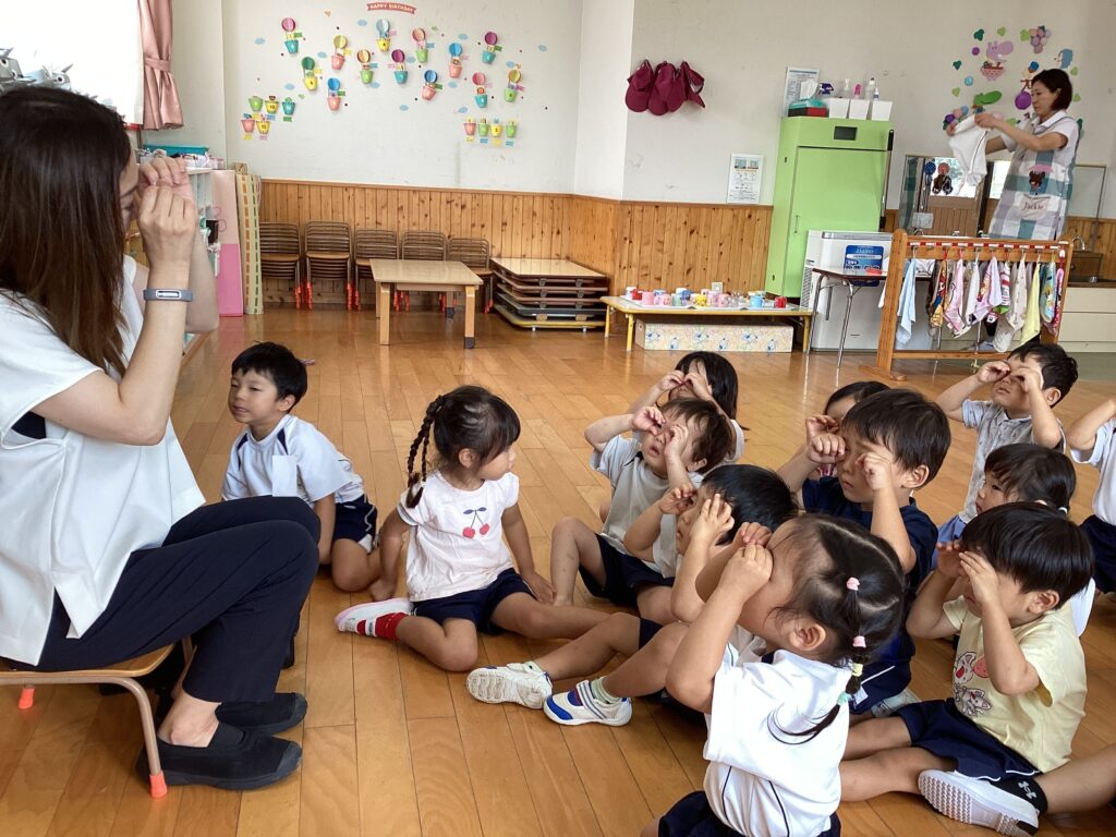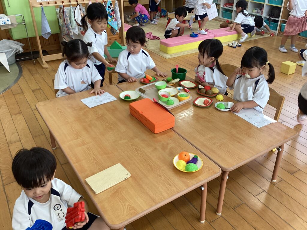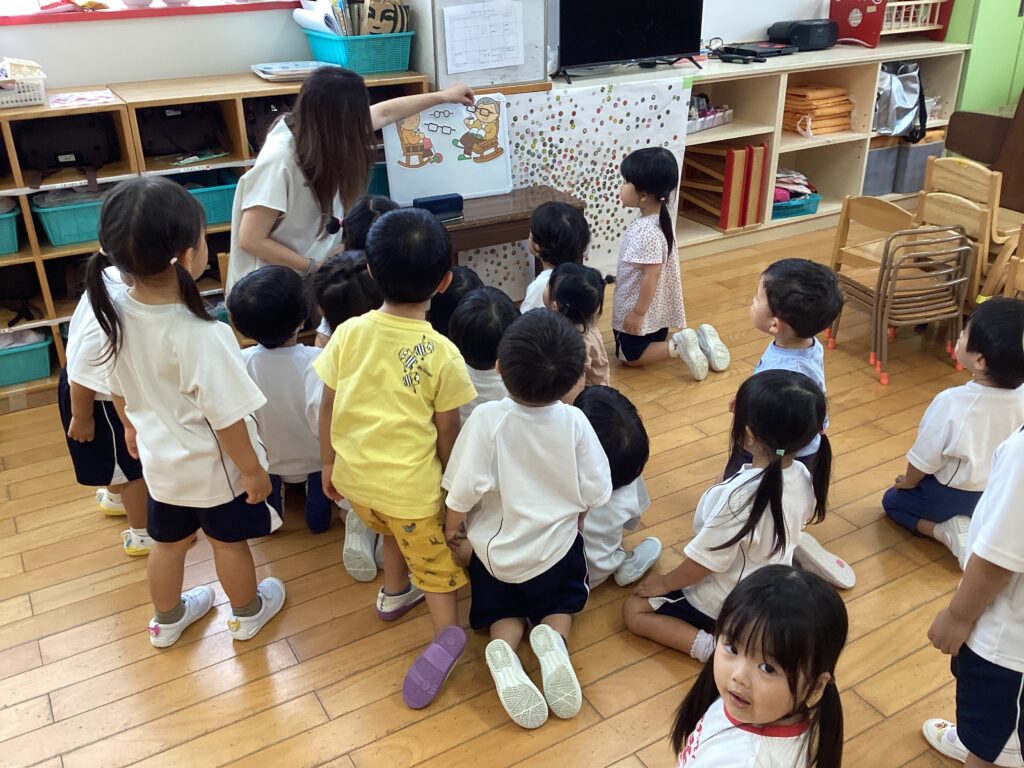 未分類 今週のあんず組(2歳児) 2025.09.26 毎週楽しみにしているエイミー先生と英語の時間です!手でメガネを作って、メガネをかけたり外したり、歌ったりしました! お部屋では、椅子をたくさん並べてお家にしたり座ることを楽しんだりしていました。 おままごとのごちそうを机に運んでピクニックかな?みんなで食べて美味しかったね! 少し涼しいと感じる時間も出てきました。お外遊びでは滑り台や砂場、一本橋をして楽しんでいます。来週もたくさん遊ぼうね。 令和7年9月26日(金) 前の記事 令和7年9月29日(月) 次の記事