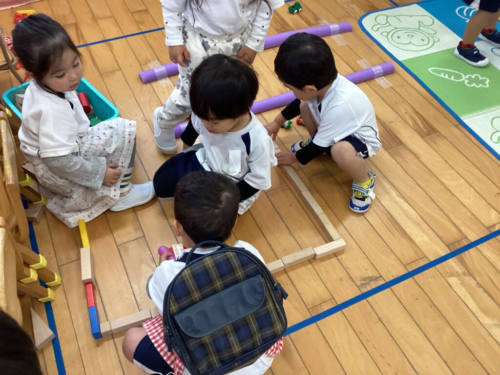 あんず2組さんは、積み木を並べて道を作ったりお家の形にしたりして遊びました。